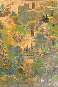 但巖山寺金代壁畫有確切年代,是御前承應畫匠王逵用10年時間才完成這一煌煌巨制。800多年前,王逵面對四壁,決然舍棄慣常的連環(huán)畫形式,大膽獨創(chuàng),采用滿幅構(gòu)圖形式,以一組繁雜的宮廷建筑為中心,配以各種故事情節(jié)畫面,然后用山水、樹石、云嵐連結(jié),細部真實,透視準確,遠看儼然一幅氣勢磅礴的大型山水畫,近瞧卻又章回分明。壁畫上就有多處使用瀝粉堆金裝飾,顯現(xiàn)金碧輝煌、富麗非凡的效果。這樣大面積的工筆重彩畫,一絲不茍,找不到起稿與粉本痕跡,而且線條變化多樣,無一廢筆,令人驚嘆。