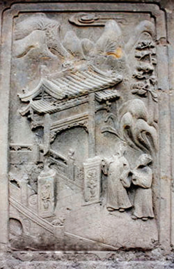 配坊實(shí)際上是一座功名石牌坊,上面刊載著武訪疇一家四代人的姓名及朝廷贈封的官爵,咸豐六年(1856)由武訪疇修建。這座石雕牌坊與其它牌坊最大的區(qū)別就是沒有題刻坊名,因此只能稱之為配坊。坐北向南,為四柱三間三樓單檐歇山頂結(jié)構(gòu),牌樓高8米,寬12米,坊體坐落在近1米高的長方形臺基上,立柱仍然采用夾柱石固定。坊頂覆蓋青瓦,正脊飾石雕貔貅裝飾,飛檐翹角,明樓檐下為“圣旨”牌,當(dāng)心間設(shè)兩層小字板,第一層題刻:“贈資政大夫曾祖父廷桂,贈夫人曾祖母李氏;誥贈資政大夫祖父秉壁,誥贈夫人祖母吳氏;誥贈資政大夫父烈,誥封夫人母朱氏。陜西分巡延榆綏兵備道、加四級武訪疇謹(jǐn)建?!钡诙宇}刻“大清咸豐六年歲次丙辰仲夏上院榖旦”。武訪疇借建坊要弘揚(yáng)祖輩陰德,而祖輩的姓氏大名又不能題刻在母親的節(jié)孝牌坊上,所以,他必須另建一坊才能完整地表達(dá)心愿。實(shí)際上,這就是建造配坊的真正目的。也正因此在配坊題刻“龍光錫寵”、“鳳詔褒榮”、“克成先志”、“重裕后昆”等。
