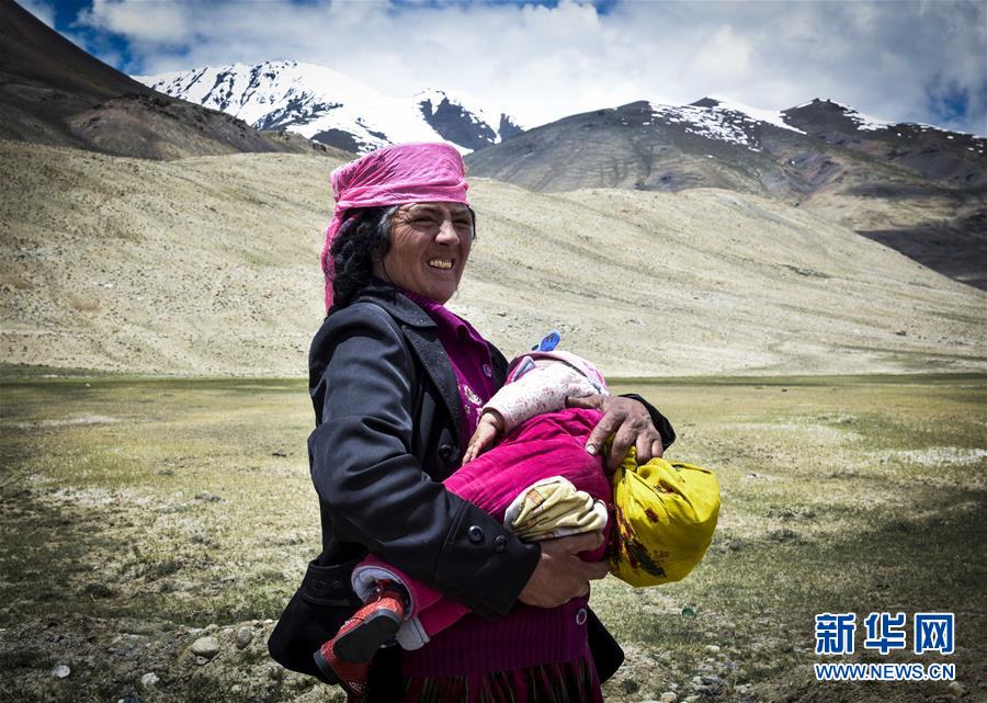 在帕米爾高原瓦罕走廊,一位牧民抱著孫子去親戚家串門(6月4日攝)。6月的帕米爾高原風光旖旎,吸引國內(nèi)外大量游客前來領略它的神韻。 新華社記者 趙戈 攝