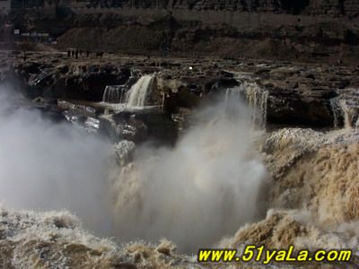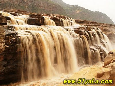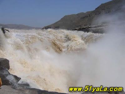 壺口瀑布位于吉縣城西45公里、距臨汾市165公里處的晉陜峽谷黃河河床中,為世界上最大的黃色瀑布,因其氣勢雄渾而享譽中外。此地兩岸夾山,河底石巖上沖刷成一巨溝,寬達30米,深約50米,滾滾黃水奔流至此,倒懸傾注,若奔馬直入河溝,波浪翻滾,驚濤怒吼,震聲數(shù)里可聞。其形如巨壺沸騰,故名。黃河浪濤激起一團團霧煙云隨著水霧的升高,煙云由黃變灰、由灰變藍,景色奇麗,有“水底生煙”之說。壺口瀑布不僅有“水底冒煙”,“彩橋通天”奇景,更有“旱地行船”之說。上游船只到此,必須離水登陸,經(jīng)人抬或車運繞過壺口(即所謂“旱地行船”)方可入水續(xù)航,千百年來,概莫能變。