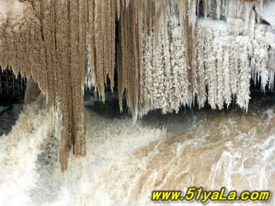 由于四季氣候和水量的差異,壺口景色也時有所變。壺口的春秋兩季,景象也甚為奇特,有氣為虹,橫浮水上,形成了“岸旁無虹掛長雨”的景觀。春回大地的時候,漫山遍野的山桃花盛開,黃河冰岸消融,水量適度平穩(wěn),主瀑、副瀑連成一片,看主瀑云霧迷蒙,望副瀑萬壑千流,觀“龍槽”如巨龍掀浪,稱為“三月桃花汛”;秋季9-11月份雨季剛過去時,河邊眾多山泉小溪,匯集大量清流,陣陣秋風吹過,常有彩虹出現(xiàn),叫做“壺口秋風”。明陳維藩《壺口秋風》詩有“秋風卷起千層浪,晚日迎來萬丈紅”句,可謂真實寫照。這兩個時期,水大而穩(wěn),瀑布寬度可達千米左右。主瀑難以接近,但遠遠望去,煙波浩淼,威武雄壯。大浪卷著水泡,奔騰咆哮,以翻江倒海之勢,飛流而下。壺口的冬日,又是一種奇觀:壺口兩側,冰簾垂掛,晶瑩剔透,格外誘人,農(nóng)歷小雪,大雪前后,上游漂流下來的大冰塊,落入壺口平緩處,冰塊相交,冰峰凍結,冰橋天然合成,人履冰橋,如走坦途,人們稱為“壺口叉橋”。在天橋村附近,積冰成橋,冰橋下激流滾滾,濤聲大作,人們稱之為“天橋”。