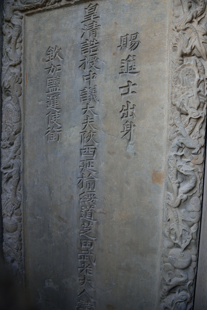 配坊實際上是一座功名石牌坊,上面刊載著武訪疇一家四代人的姓名及朝廷贈封的官爵,咸豐六年(1856)由武訪疇修建。這座石雕牌坊與其它牌坊最大的區(qū)別就是沒有題刻坊名,因此只能稱之為配坊。坐北向南,為四柱三間三樓單檐歇山頂結(jié)構(gòu),牌樓高8米,寬12米,坊體坐落在近1米高的長方形臺基上,立柱仍然采用夾柱石固定。坊頂覆蓋青瓦,正脊飾石雕貔貅裝飾,飛檐翹角,明樓檐下為“圣旨”牌,當心間設兩層小字板,第一層題刻:“贈資政大夫曾祖父廷桂,贈夫人曾祖母李氏;誥贈資政大夫祖父秉壁,誥贈夫人祖母吳氏;誥贈資政大夫父烈,誥封夫人母朱氏。陜西分巡延榆綏兵備道、加四級武訪疇謹建?!钡诙宇}刻“大清咸豐六年歲次丙辰仲夏上院榖旦”。武訪疇借建坊要弘揚祖輩陰德,而祖輩的姓氏大名又不能題刻在母親的節(jié)孝牌坊上,所以,他必須另建一坊才能完整地表達心愿。實際上,這就是建造配坊的真正目的。也正因此在配坊題刻“龍光錫寵”、“鳳詔褒榮”、“克成先志”、“重裕后昆”等。