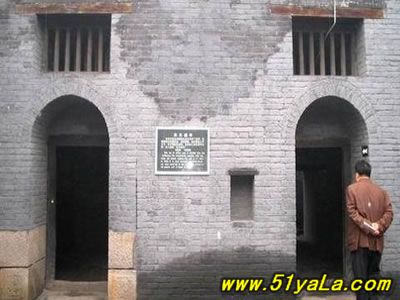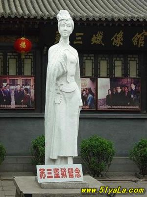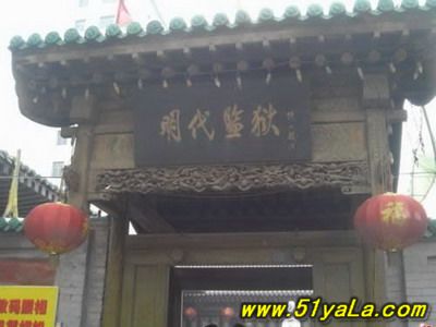 “蘇三監(jiān)獄”在今洪洞縣政府院內(nèi)西南,亦即明洪洞縣衙西南角。一進(jìn)掛有“明代監(jiān)獄”匾額的大門(mén),首先看到的便是蘇三的塑像,外院當(dāng)年監(jiān)獄的辦公場(chǎng)所,右邊的院落是普通監(jiān)牢,中間是過(guò)道,兩邊共有監(jiān)牢十余間,過(guò)道頂上布有鐵絲網(wǎng),網(wǎng)上掛有銅鈴,一有犯人企圖越墻逃跑,便會(huì)觸響銅鈴。過(guò)道的盡頭,正對(duì)的是獄卒的值班室,右面的墻上有獄神的供位,傳說(shuō)當(dāng)年囚犯入獄都要參拜獄神,就是獄神下面的墻基處,有一小洞,是當(dāng)年運(yùn)送尸體的出口,犯人在獄中病死或是被打死,是不能從大門(mén)抬出去的,只能從這個(gè)小洞拉出去。過(guò)道盡頭的左邊,便是死囚牢的大門(mén),死囚牢雙門(mén)雙墻,門(mén)上畫(huà)有狴犴,狴犴是龍的兒子,長(zhǎng)得卻象老虎,因此人們誤稱(chēng)為“虎頭牢”,大約是因?yàn)辇埳抛樱幼硬煌?,狴犴?zhuān)門(mén)掌管刑獄,大門(mén)只有一米六高,所有進(jìn)入死囚牢的人都要在狴犴像前低頭,顯示對(duì)法律的敬畏。進(jìn)了門(mén)洞,里面還有一道門(mén),而這兩道門(mén)卻是一扇從右開(kāi),一扇從左開(kāi),不明就里的囚犯如果越獄,往往出了第一道門(mén)卻怎么也打不開(kāi)第二道門(mén),一個(gè)小小的改動(dòng)就能起到拖延犯人越獄時(shí)間的作用,不能不佩服古人的智慧。進(jìn)入死牢院,右面是一堵高墻,左面就是當(dāng)年關(guān)押蘇三的牢房,里面有蘇三的塑像。死囚院的中央還有當(dāng)年蘇三坐監(jiān)時(shí)洗衣的水井和石槽,井口留有一道道繩索磨下的印記,井口只有半尺多寬,這是為了防止死囚投井自殺。據(jù)說(shuō),右面的高墻里灌裝的都是流沙,如果犯人想要挖墻越獄,流沙便會(huì)從挖開(kāi)的小口中源源不斷地流來(lái),使其難以挖通圍墻。1964年我國(guó)著名考古學(xué)家王冶秋先生曾在洪洞考察確認(rèn),蘇三監(jiān)獄為我國(guó)罕見(jiàn)的明代監(jiān)獄,并題詩(shī)曰:“虎頭牢里羈紅妝,一曲攪亂臭水漿。王三公子今何在?此處空留丈八墻?!笔陝?dòng)亂期間,蘇三監(jiān)獄被拆毀。為了使“蘇三監(jiān)獄”這一僅存的明代監(jiān)獄得以保留,洪洞縣人民政府后做出了修復(fù)“明代蘇三監(jiān)獄”的決定。修復(fù)事宜于1984年5月開(kāi)始,同年10月竣工。