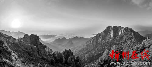 站在峰巔,舉目眺望,但見(jiàn)在初升的陽(yáng)光照耀下,經(jīng)過(guò)大雨洗滌的綠色山峰,呈現(xiàn)出一種奇異的火紅色彩,別有一番神韻。環(huán)顧四周,峰巒重疊,溝壑縱橫,石猴山、臥虎山等30多座海拔2000多米以上的兄弟峰巒,簇?fù)碇盖偷奶J芽諸山,其勢(shì)綿延不絕,氣象磅礴壯觀。云霧在山峰飄蕩,如煙似雨,彌漫四合。尖峭高聳、怪石嶙峋的蘆芽諸山,突出于翻伏騰涌的云霧之上,仿佛蔥蘢茁壯的蘆芽破石而出,生機(jī)勃勃,鮮嫩欲滴,翠色宜人。