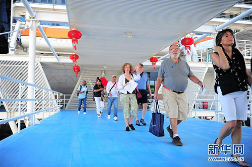 1月31日,在三亞鳳凰島國際郵輪港,“威斯特丹號”游客準(zhǔn)備上岸。 新華社發(fā)(沙曉峰 攝)