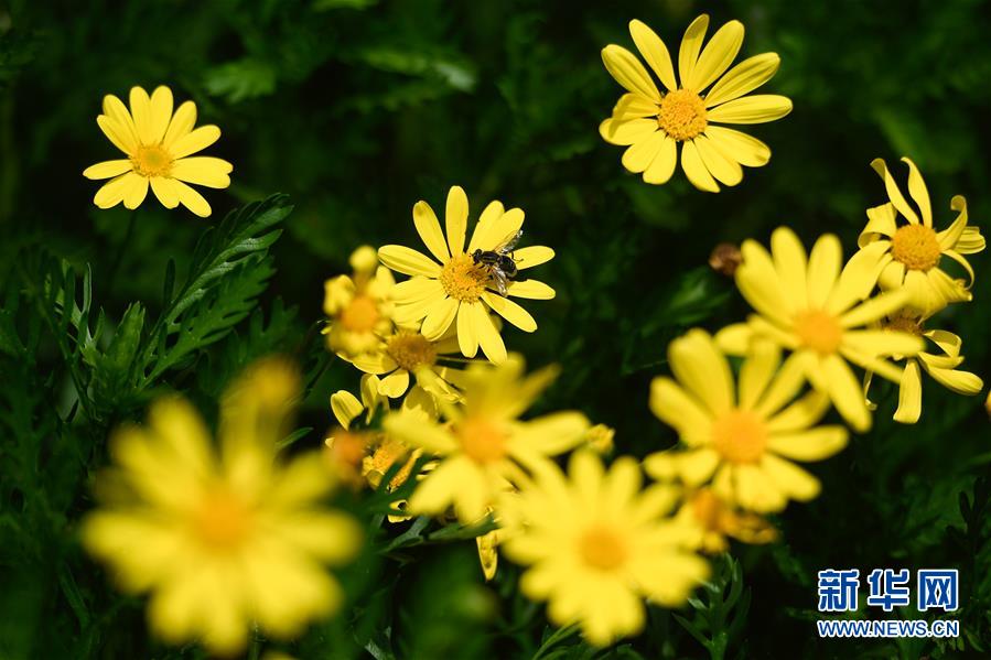 4月26日,蜜蜂在西溪濕地一片盛開的黃金菊上采蜜。 近日,第十屆“西溪花朝節(jié)”在杭州西溪國家濕地公園舉辦,沿著綠堤布置的百萬盆花卉次第綻放,呈現(xiàn)出一片片“浪漫花海”的景象。 新華社記者 黃宗治 攝