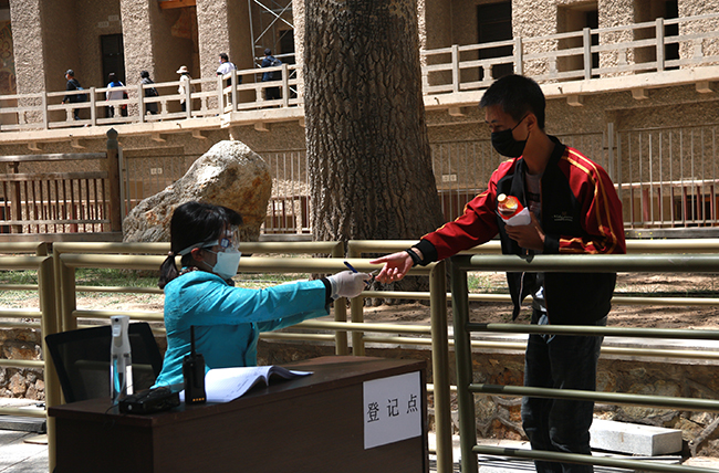 工作人員對游客信息進(jìn)行登記。 敦煌研究院文化弘揚(yáng)部部長李萍說:“這一次我們就是選擇大型洞子,并且這些洞子開放的都是有依據(jù)的。這些洞子通風(fēng)好,洞內(nèi)的空氣流動(dòng)也比較頻繁。并且洞子比較大,它的面積承載量也比較大?!?/p> 在莫高窟,敦煌研究院對疫情防控做了周密安排,加派工作人員引導(dǎo)游客,增設(shè)了多處消殺點(diǎn)。李萍說:“我們對講解員的自身有一些防控要求,講解員戴了口罩,佩戴了護(hù)目鏡還有手套,還有電筒的消毒。在洞窟內(nèi),我們壓縮了講解時(shí)間,把一些洞窟內(nèi)的知識(shí)放在洞外來多講一些。” 5月10日共開放26個(gè)洞窟,游客10人一組進(jìn)窟參觀,每組可參觀8個(gè)洞窟。開放當(dāng)天總共有663名游客預(yù)約,包括全國26個(gè)省、市、自治區(qū),其中甘肅省占12%。截至下午14時(shí),加上線下售票,莫高窟接待游客達(dá)到873人,預(yù)計(jì)全天參觀人數(shù)將超過千人。