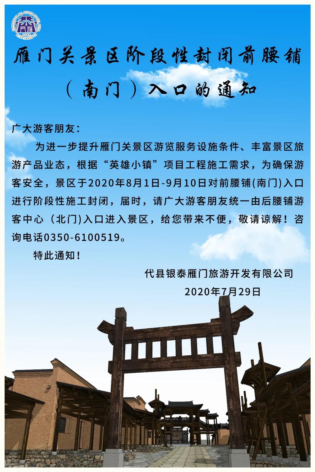 為進(jìn)一步提升雁門關(guān)景區(qū)游覽服務(wù)設(shè)施條件、豐富景區(qū)旅游產(chǎn)品業(yè)態(tài),根據(jù)“英雄小鎮(zhèn)”項(xiàng)目工程施工需求,為確保游客安全,景區(qū)于2020年8月1日-9月10日對(duì)前腰鋪(南門)入口進(jìn)行階段性施工封閉,屆時(shí),請(qǐng)廣大游客朋友統(tǒng)一由后腰鋪游客中心(北門)入口進(jìn)入景區(qū),給您帶來(lái)不便,敬請(qǐng)諒解!咨詢電話0350-6100519。