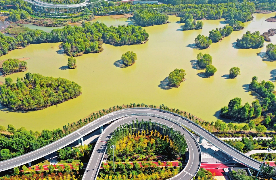 10月10日,俯瞰汾河公園攝樂橋下,汾河水碧波蕩漾,河岸層林盡染。步入汾河公園,河水在陽光下閃爍著、流淌著,沼澤地里水草搖曳,野花與周邊的山脈相映成趣,恰似一幅動(dòng)人的寫意山水畫。(記者劉通攝)