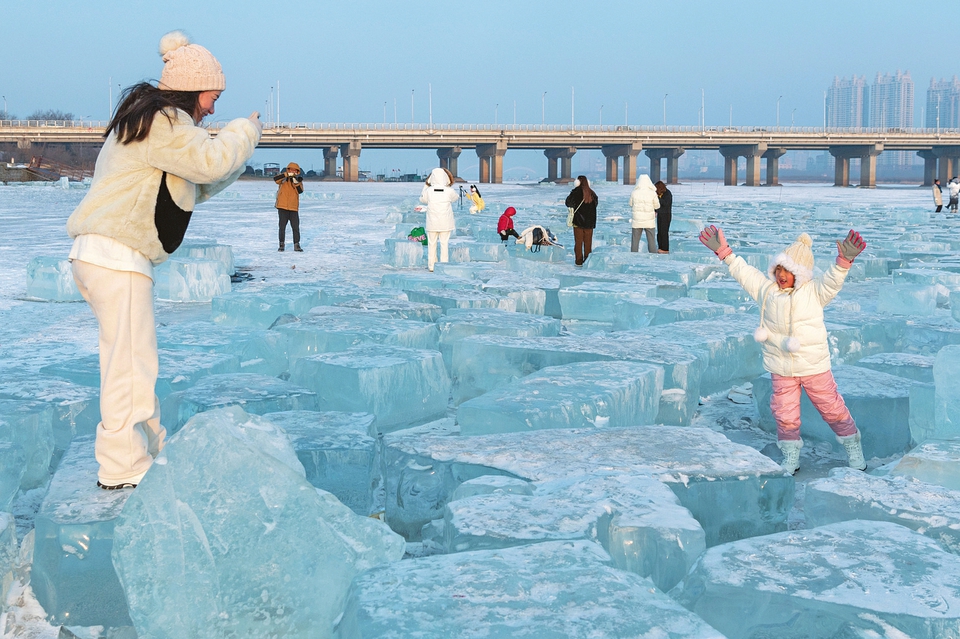 2月1日,游客在松花江哈爾濱段江畔的“鉆石?!庇瓮?。時下,“冰城”哈爾濱市正值冰雪旅游“黃金季”。在松花江哈爾濱段江畔,曾是哈爾濱冰雪大世界采冰區(qū)域的一片封凍江面,因散布晶瑩的冰塊,被游客稱為“鉆石?!?,成為哈爾濱新的旅游打卡地。