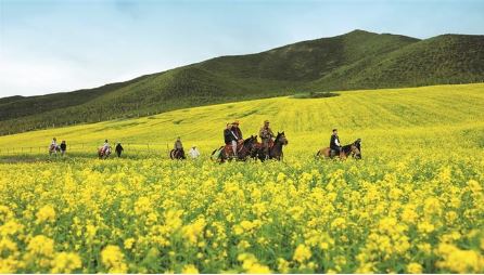 七月十三日,游客騎馬游覽甘肅省張掖市民樂縣扁都口生態(tài)景區(qū)油菜花海。