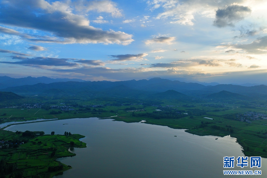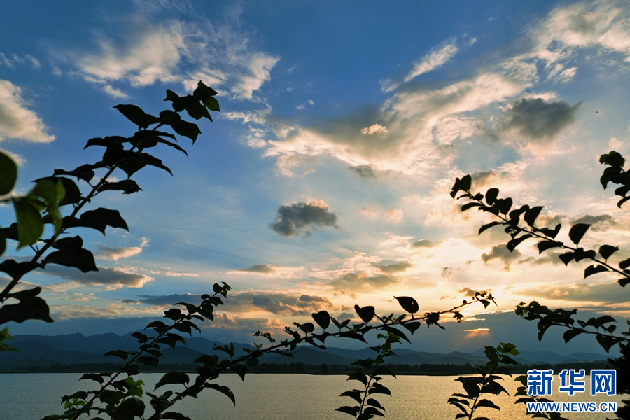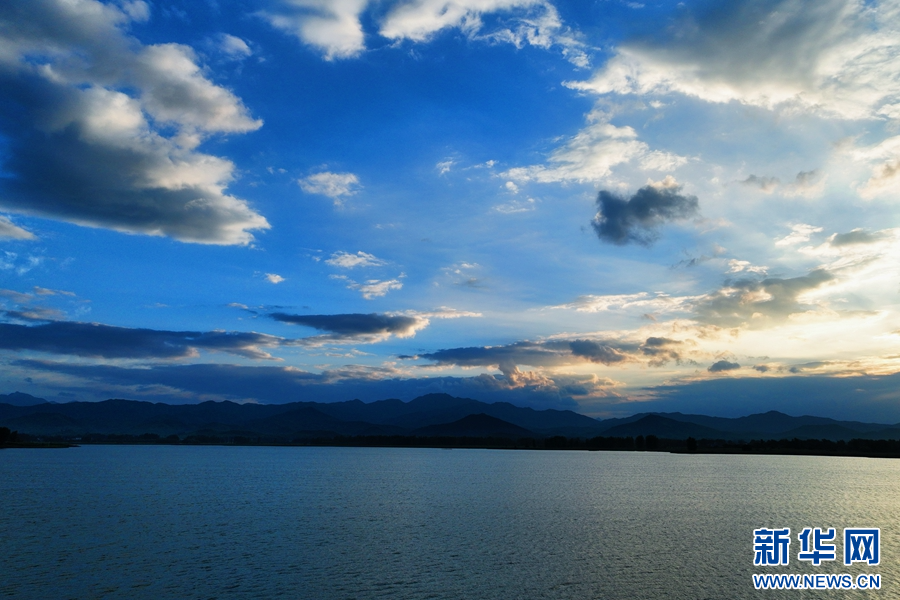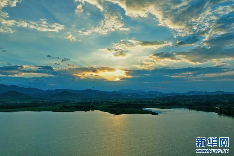 7月27日,河南省南陽(yáng)市鎮(zhèn)平縣上空朝霞滿天,天空、云朵、群山、水面在霞光的映襯下,宛若一個(gè)巨大的調(diào)色盤(pán),美如畫(huà)卷。新華網(wǎng)發(fā)(圖文/時(shí)君洋)