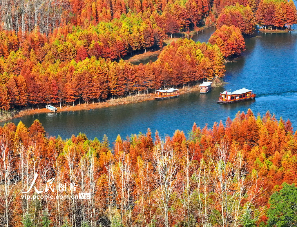 初冬時節(jié),江蘇省淮安市盱眙縣天泉湖色彩斑斕,落羽杉林枝葉飄紅,與碧水相映成趣,構(gòu)成一幅美麗的冬日生態(tài)畫卷。方東旭攝(人民圖片網(wǎng))