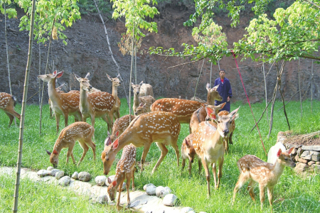 基地采用“公司+基地+合作社+農(nóng)戶”的經(jīng)營模式,鼓勵和扶持農(nóng)戶認養(yǎng)梅花鹿和種植農(nóng)作物,并以訂單式回收,確保農(nóng)戶收益。上桑林村村民劉海軍四年前認養(yǎng)了兩頭鹿,每年每頭鹿凈增收4000多元?!拔艺J養(yǎng)的是公鹿,村里認養(yǎng)母鹿的收入更多,畢竟生下的小鹿都是個人的。還有在基地上班的也不少掙。”