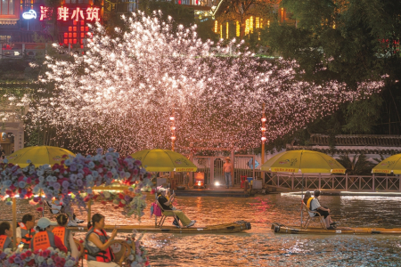 7月9日,游客乘坐“龍游貢水”竹筏在貢水河上觀賞打鐵花表演。位于湖北省恩施土家族苗族自治州的宣恩縣城是一座“景城一體·主客共享”的國家4A級(jí)景區(qū)。近年來,當(dāng)?shù)夭粩嗤脐惓鲂碌摹褒堄呜曀敝穹?、烏篷船等體驗(yàn)和觀賞項(xiàng)目,讓游客在璀璨燈火中沉浸式感受山區(qū)小城的夜色魅力。