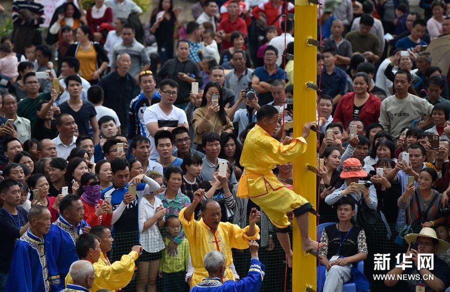 農(nóng)歷十月十五前后,福建西部武平縣各山村陸續(xù)進(jìn)入農(nóng)閑時(shí)節(jié)。按照當(dāng)?shù)仫L(fēng)俗,不同村子各自擇日舉辦民間活動(dòng),其中較有代表性的就是“上刀山”絕技。“上刀山”絕技在閩西山村流傳已有數(shù)百年歷史,表演者需光腳順著磨得鋒利閃亮的36把鋼刀,攀登至8米高的杉木柱子頂部,接受長(zhǎng)者祝福,祈求風(fēng)調(diào)雨順、五谷豐登。新華社記者 宋為偉 攝 |