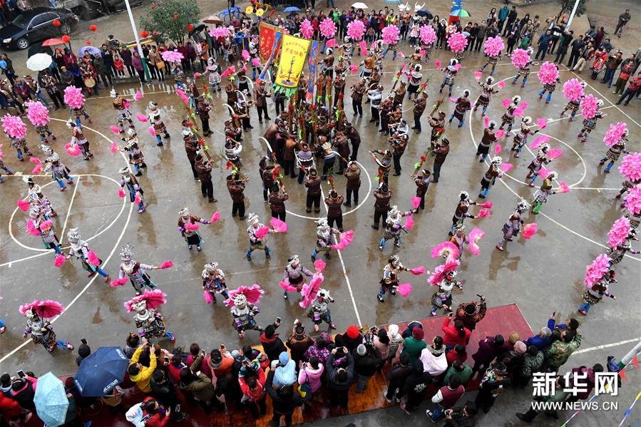 2月7日,廣西融水苗族自治縣安太鄉(xiāng)苗族群眾開展傳統(tǒng)的“打同年”民俗活動。當(dāng)?shù)財?shù)百名苗族同胞與游客們歡聚一堂,一起開展對歌、蘆笙踩堂、文藝晚會等活動,歡慶新春佳節(jié)。 “打同年”是融水苗族村寨的一種民俗,即友好村寨之間的拜年聯(lián)歡活動。新華社記者 李斌 攝