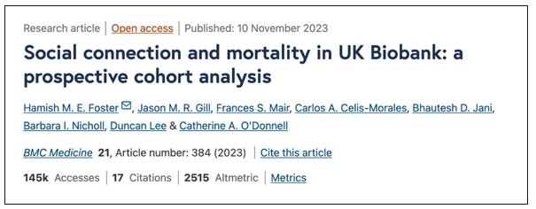 [1] Foster HME, Gill JMR, Mair FS, Celis-Morales CA, Jani BD, Nicholl BI, Lee D, O'Donnell CA. Social connection and mortality in UK Biobank: a prospective cohort analysis. BMC Med. 2023 Nov 10;21(1):384.