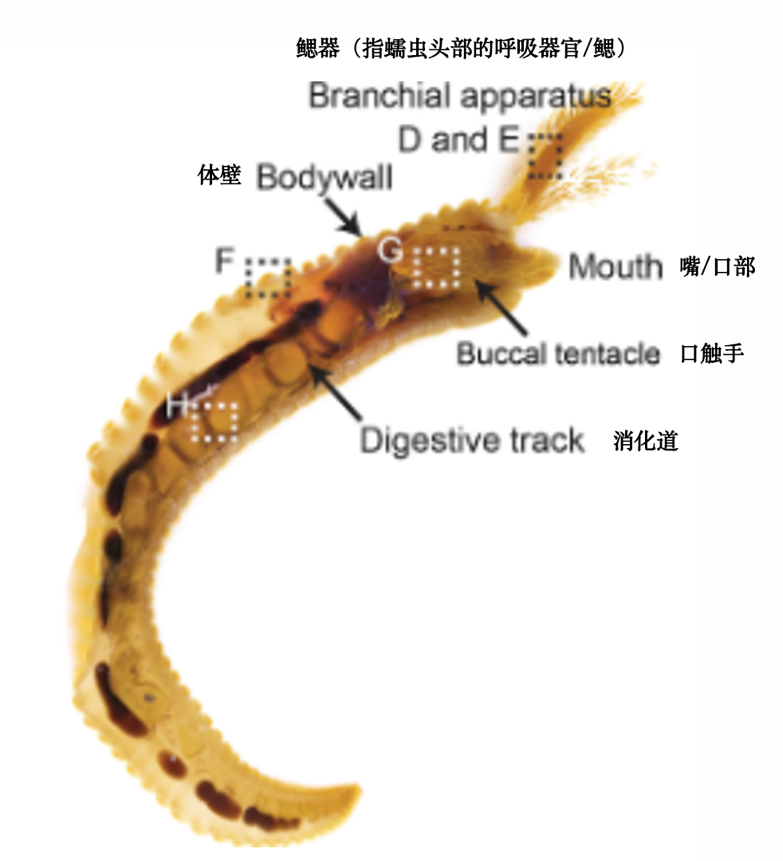 通過(guò)顯微鏡觀察,科學(xué)家發(fā)現(xiàn)蠕蟲的上皮細(xì)胞中充滿了直徑0.77-1.29微米的黃色顆粒。這些顆粒不僅存在于體表,還分布在鰓、口觸手和消化道中——所有與海水直接接觸的部位。