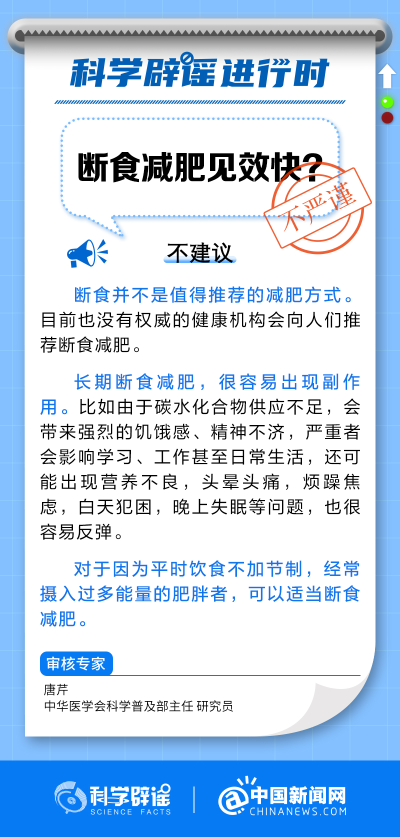 中新網(wǎng)12月26日電 斷食并不是值得推薦的減肥方式。目前也沒有權(quán)威的健康機構(gòu)會向人們推薦斷食減肥。長期斷食減肥,很容易出現(xiàn)多種副作用。(來源:@科學辟謠 中國新聞網(wǎng)微博)
