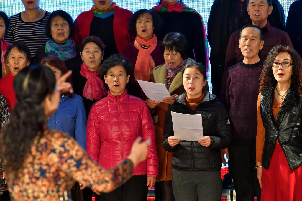 ↑1月3日,在山西省渾源縣荊莊村,渾源縣貧困山區(qū)合唱團在表演大合唱《祝福祖國》。