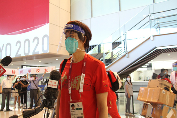 7月19日晚,中國女排主教練郎平在抵達(dá)東京成田機(jī)場后接受媒體采訪。李沐航攝