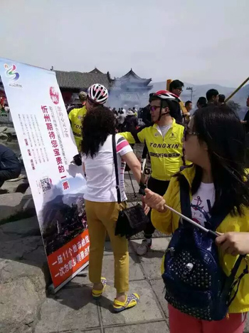 5月19日,在第六個(gè)“中國旅游日”,共青團(tuán)五臺縣委組織20余名青年騎行愛好者,騎著單車來到五臺山核心景區(qū),拉起宣傳畫,耐心向來山游客講解投票方法,動員廣大游客為忻州申辦山西旅游發(fā)展大會投下寶貴一票。(劉力強(qiáng) 攝)