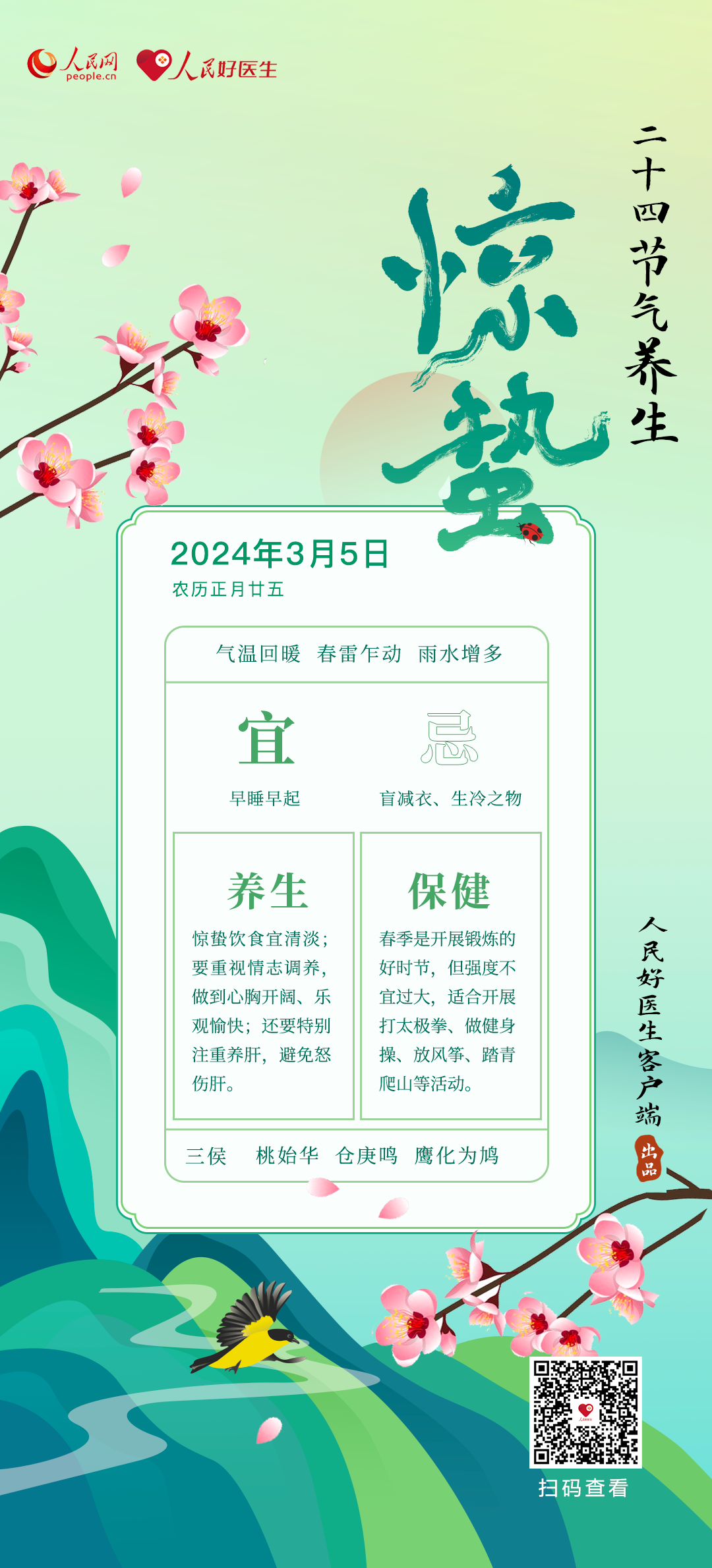 —年有四時變化,有24個節(jié)氣的更替,不同的節(jié)氣有不同的氣候,這些氣候變化與人體健康息息相關(guān)?!秱€人健康手冊(二十四節(jié)氣)》系列,是人民網(wǎng)·人民好醫(yī)生客戶端邀請知名中醫(yī)專家,根據(jù)二十四節(jié)氣的變化規(guī)律,通過防病調(diào)理、飲食養(yǎng)生、運(yùn)動按摩等,調(diào)整人體節(jié)律,平衡陰陽,與自然界的陰陽變化相應(yīng),從而達(dá)到健康養(yǎng)生的目的。想了解更多驚蟄養(yǎng)生知識,請點(diǎn)擊查看《個人健康手冊(二十四節(jié)氣·驚蟄篇)》。