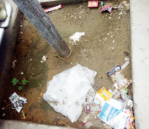 近日,記者在華榮區(qū)發(fā)現(xiàn),路旁的很多樹坑被當(dāng)成了垃圾桶,人們隨手將果皮紙屑塑料袋扔在了里面,影響市容不說也污染了環(huán)境。樹坑內(nèi)垃圾不但難于清理,而且污水滲入土內(nèi)會導(dǎo)致樹木根部和樹皮底部的腐爛。同時(shí),長久被油污浸泡的土地會變成“ 油土”,樹木無法正常呼吸,最終導(dǎo)致死亡。馬路兩旁的行道樹不僅可以凈化空氣、美化市容市貌,在夏天的時(shí)候還能給行人提供天然的蔭涼。希望附近的居民能夠管住自己的手,不要再向樹坑內(nèi)扔垃圾,養(yǎng)成愛護(hù)環(huán)境的文明習(xí)慣。實(shí)習(xí)記者 王菲 攝