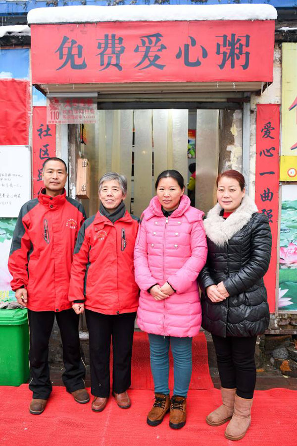 圖說:蔣愛榮(左二)與志愿者們在愛心粥屋前合影(11月23日攝)。圖片來源:新華社