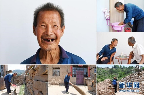 魏連保,男,1949年出生,山西省長治市沁源縣支角村人。獨居的他生活不便,2017年年底,村委會為魏連保在內(nèi)的8位老人修建了一排整齊的新居,并統(tǒng)一安排就餐。 左上:魏連保肖像;右上:魏連保在新居洗臉;右中:魏連保(左)在新居和鄰居李秀成聊天;下右:魏連保在舊居前留影;下中:魏連保在舊居打掃院子;下左:魏連保在舊居為蔬菜澆水(拼版照片,6月18日攝)。 地處晉東南的山西省長治市,位于由太行山、太岳山環(huán)繞而成的上黨盆地中。在群山中、崖壁上,許多村莊自然條件惡劣,基礎(chǔ)設(shè)施落后,脫貧致富是大山深處人們的迫切心愿。 近年來,一場場脫貧攻堅戰(zhàn),在一個個深山村打響。政府全力探索脫貧路徑的同時,山區(qū)百姓因地制宜,靠自己的雙手和智慧走上致富路,交出了一份扎實的脫貧答卷。 記者在太行山、太岳山一路尋訪,記錄下多位70歲老人的生活。這些共和國的同齡人,親歷了山鄉(xiāng)的巨變,見證著長治山區(qū)脫貧攻堅偉大工程的一步步推進。 新華社記者 楊晨光 攝