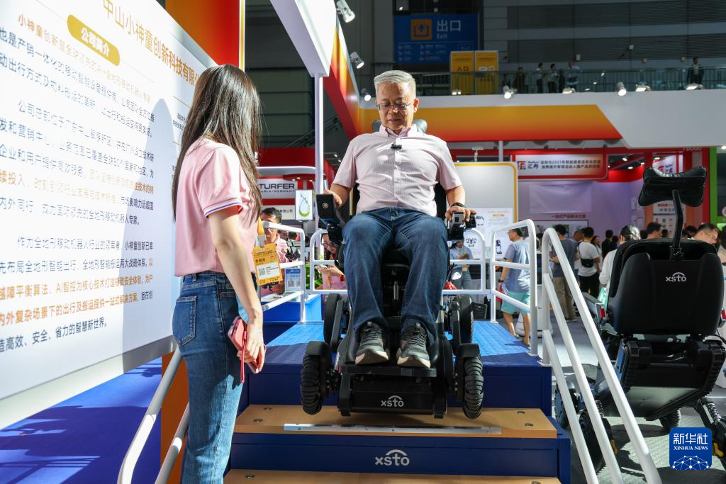 9月12日,觀眾在國際智慧養(yǎng)老產(chǎn)業(yè)博覽會現(xiàn)場體驗智能出行機(jī)器人。新華社記者 梁旭 攝