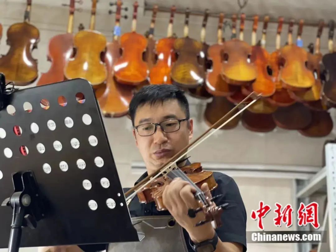 黃橋?qū)W生拉小提琴。黃國(guó)建 攝 “肩膀、手臂放松,按弦指根發(fā)力”……暑假期間,黃橋鎮(zhèn)上的音樂教室里,傳來陣陣悠揚(yáng)的琴聲,學(xué)生拉小提琴,音樂老師在一旁打著拍子,講授提琴技法。 小提琴早已融入了當(dāng)?shù)厣?。黃橋的小學(xué)和初中校園里,幾乎每個(gè)孩子都會(huì)演奏一門樂器。行走在黃橋大街小巷、田間地頭,時(shí)常有清脆悅耳的小提琴聲傳來。 老一代制琴,新生代接力傳承,趟出一條產(chǎn)業(yè)發(fā)展新路。 徐小峰是土生土長(zhǎng)的泰興人,2001年考入上海音樂學(xué)院提琴研制室,系統(tǒng)地學(xué)習(xí)相關(guān)理論知識(shí),畢業(yè)后又進(jìn)入中央音樂學(xué)院深造,現(xiàn)為國(guó)家高級(jí)制琴師、泰興新生一代制琴人。