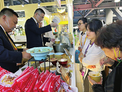“此次參會(huì),山西會(huì)務(wù)集團(tuán)特別準(zhǔn)備了近年推陳出新、改良工藝的美食新品,希望以美食為載體,以文化為橋梁,讓更多人了解山西、走進(jìn)山西、愛(ài)上山西、投資山西?!蓖醮喝A說(shuō),“從連續(xù)幾天觀眾的反饋來(lái)看,山西刀削面、莜面栲栳栳最受大家歡迎,每天都有人排長(zhǎng)隊(duì)品嘗,可以說(shuō)供不應(yīng)求。此外,酥脆香甜的原平鍋盔、用石子炒制的石頭餅、精心烘焙的黃花餅、經(jīng)典小吃柳林碗托等都是觀眾愛(ài)吃的‘爆款’,再配合精彩的面食表演,來(lái)往客商連連點(diǎn)贊,直呼好吃好看?!?/p>