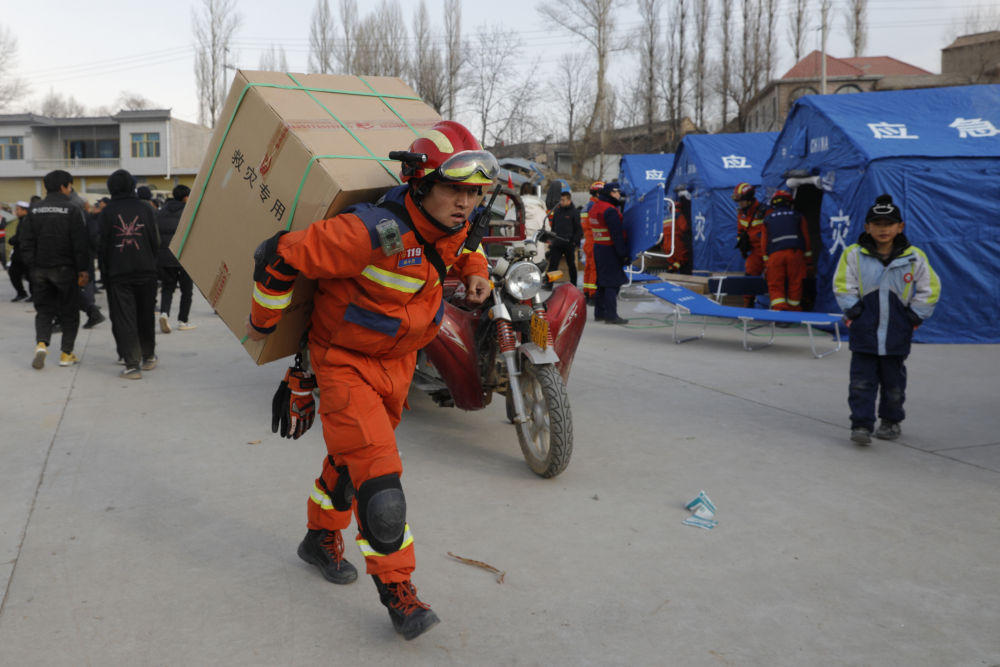 ↑ 12月19日,在甘肅臨夏積石山縣大河家鎮(zhèn)大河村安置點,消防人員在搬運救援物資。新華社記者方欣攝