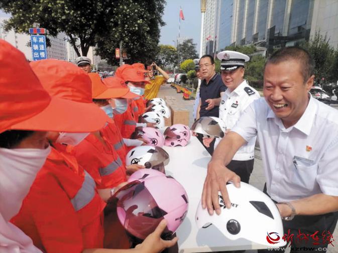 今年是我市創(chuàng)建全國(guó)文明城市的決戰(zhàn)決勝年,廣大環(huán)衛(wèi)工人一直默默奮斗在崗位上,為我市創(chuàng)文不斷努力。市公安局交警支隊(duì)始終牽掛著奮戰(zhàn)在基層一線的環(huán)衛(wèi)工人,支隊(duì)以此次贈(zèng)送頭盔活動(dòng)為契機(jī),持續(xù)關(guān)心關(guān)愛(ài)環(huán)衛(wèi)工人的生命安全和身體健康。市公安局交警支隊(duì)負(fù)責(zé)人表示:“環(huán)衛(wèi)工人大多騎著電動(dòng)三輪車(chē)或人力保潔車(chē)穿梭在大街小巷,機(jī)動(dòng)車(chē)道是他們的主要作業(yè)區(qū)之一,佩戴安全頭盔,可以大大增加他們的安全系數(shù)。同時(shí),環(huán)衛(wèi)等重點(diǎn)行業(yè)的示范引領(lǐng)作用,將有力帶動(dòng)市民遵紀(jì)守法、安全出行,為文明城市創(chuàng)建打造一道亮麗的風(fēng)景線?!眻D為捐贈(zèng)活動(dòng)現(xiàn)場(chǎng)。張志遠(yuǎn) 攝影報(bào)道