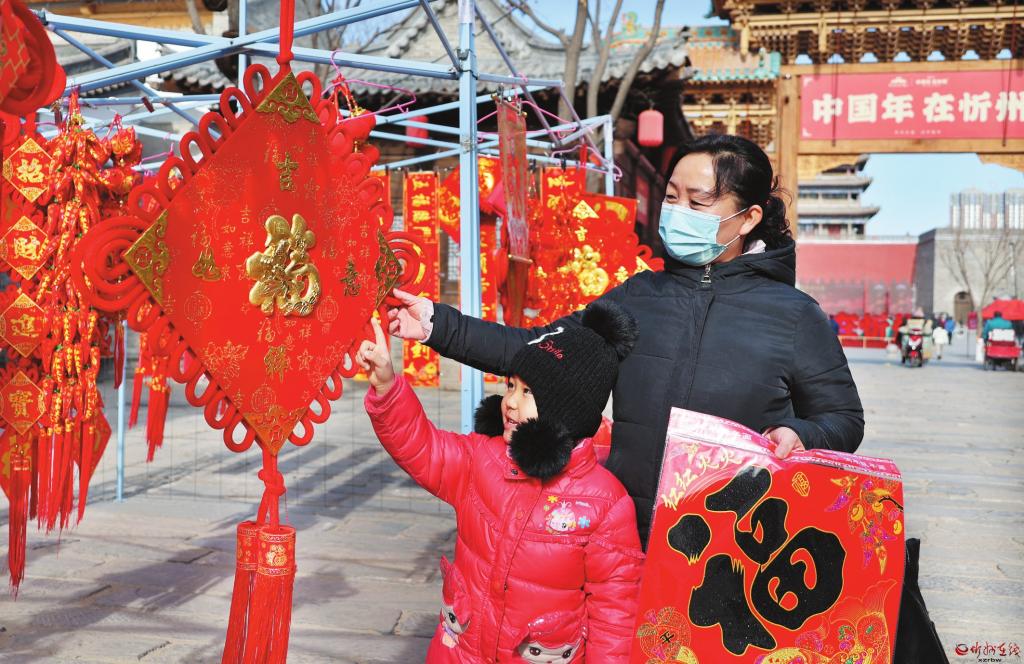 春節(jié)臨近,我市各大商場和年貨市場洋溢著濃濃的年味兒。春聯(lián)、“?!弊帧ⅰ爸袊Y”等賀歲商品琳瑯滿目,到處都是紅紅火火的過年氣氛。右圖為2月3日,市民在忻州古城南北大街集市上選購年貨。 (張存良 攝)