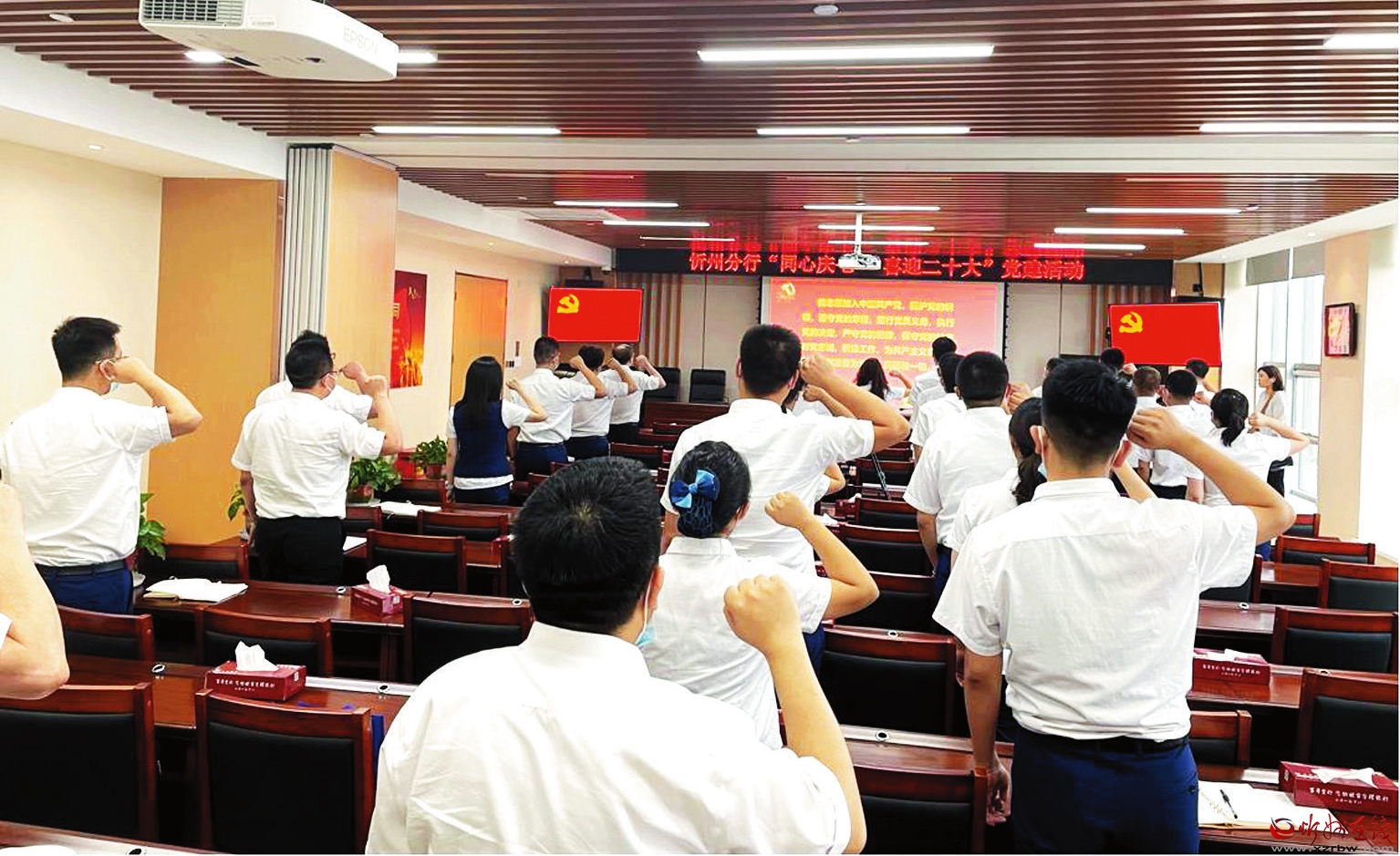 為進一步增強黨組織凝聚力和戰(zhàn)斗力,激發(fā)黨員愛黨愛國愛行熱情,引導(dǎo)全行黨員堅定信心、勇毅前行,6月30日晚,交通銀行忻州分行組織開展“同心慶七一 喜迎二十大”黨委書記講黨課活動。圖為該行黨委書記李王芳帶領(lǐng)全體黨員重溫入黨誓詞。 (蔚一凡 攝)