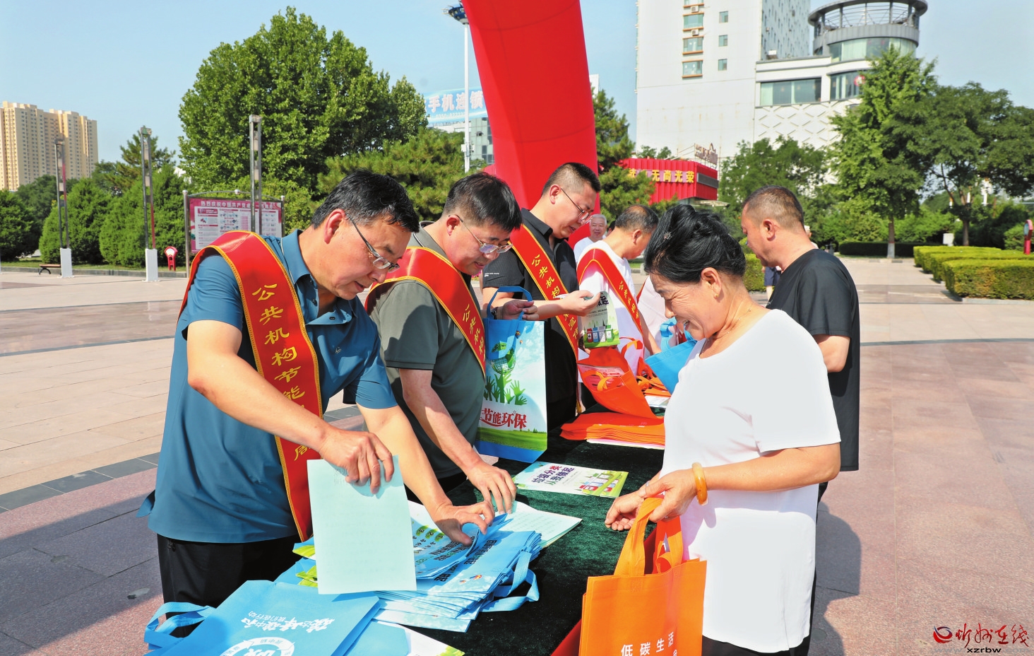 近日,原平市直屬機關(guān)事務(wù)服務(wù)中心在街心廣場開展以“節(jié)能降碳,你我同行”“積極應(yīng)對氣候變化,推動綠色低碳發(fā)展”為主題的節(jié)能宣傳周活動?,F(xiàn)場工作人員向市民宣傳《反食品浪費法》,普及碳達峰碳中和、垃圾分類等知識,鼓勵市民積極參與到節(jié)能減排的行動中,倡導綠色低碳生產(chǎn)生活方式。圖為工作人員在街心廣場向過往市民發(fā)放宣傳資料,解答市民咨詢。 (褚震 攝)
