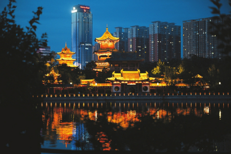 6月9日晚,太原市迎澤公園內的仿古建筑流光溢彩,宛若仙境。范文靜攝