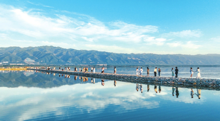 6月9日,運城市七彩鹽湖景區(qū)游人如織,藍天、白云、遠山、鹽湖構成一幅美麗畫卷,游客們宛如穿梭在“天空之鏡”。金玉敏攝