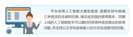 該平臺采用人工智能大模型底座,首期支持中英俄三種語言的無感知切換,滿足成員國的使用需求。同期上線的人工智能助手可以隨時回答各種語言提出的各類問題,并支持以文字和語音輸入的方式完成提問和回復(fù)。二期平臺更新后,將實現(xiàn)產(chǎn)業(yè)標(biāo)簽、企業(yè)和產(chǎn)品的自動推薦功能,人工智能在用戶注冊后,可為用戶自動生成和匹配目標(biāo)企業(yè)與目標(biāo)產(chǎn)品,優(yōu)化用戶體驗。