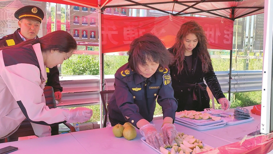 國慶長假的幾天里,隰縣4個(gè)高速口設(shè)置便民服務(wù)站,游客一進(jìn)入隰縣,就能吃到當(dāng)?shù)馗刹窟f上的玉露香梨,享受免費(fèi)引導(dǎo)服務(wù)。