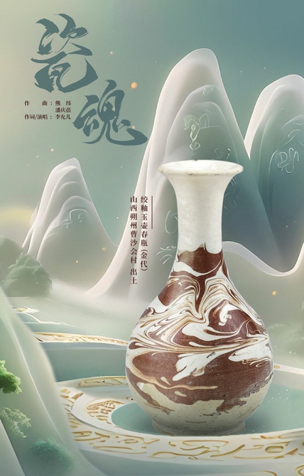 “山水近,蒼黃分,你可見丹青華彩五色泥塵……”歌曲《瓷魂》一開頭,便設(shè)置了一幅水墨畫般的意境,山水和陶瓷被置于中國傳統(tǒng)色彩的丹青之中。這里的“五色泥塵”暗喻陶土的多樣性和陶瓷的豐富色澤。接下來的“陶煙熏,素心焚”,則形象地描述了制陶過程中的火候和心力,展現(xiàn)了陶瓷匠人對完美作品的追求和執(zhí)著?!叭лd,又一春,煉成了炎黃汗青寰宇寫真”,是對中國陶瓷歷史悠久和文化深厚的贊美,更是對勇于創(chuàng)新、與時(shí)俱進(jìn)和生生不息的中華民族精神的頌揚(yáng)。