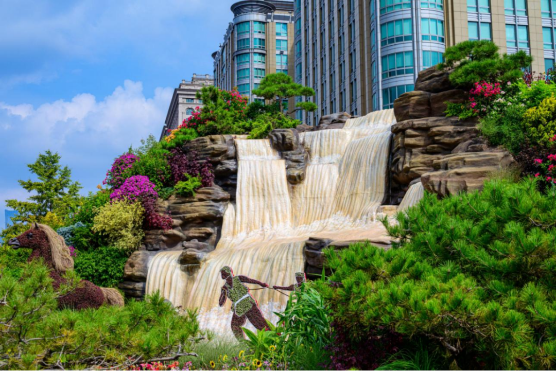 花壇主景的瀑布、山石采用玻璃鋼工藝,彩繪的瀑布與真水、迷霧共同呈現(xiàn)壺口瀑布?jí)验煹木坝^。群馬采用穴盤苗栽植工藝。造型松、龍柏、錦帶等二十余種喬灌木塑造了豐富自然的山體景觀。