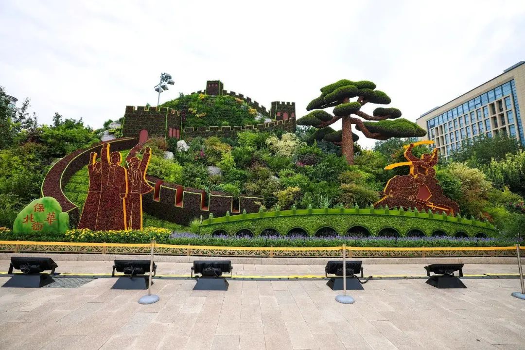 地面花卉布置融合規(guī)則式與自然式風(fēng)格,平型關(guān)下方的粉色小路采用穴盤苗栽植工藝,精選舞春花‘影子’與五色草綠草進(jìn)行精細(xì)配置,既呈現(xiàn)出細(xì)膩的造型質(zhì)感,又豐富了地面景觀的觀賞性?;▔?,還應(yīng)用了谷子、棗樹,呈現(xiàn)經(jīng)典歷史場景。