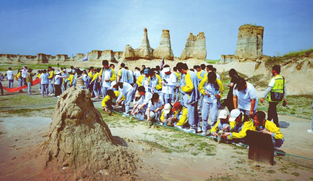 前來(lái)研學(xué)的學(xué)生們近距離觀察地貌。資料圖片