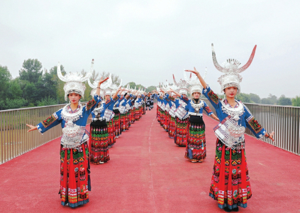 10月2日9時許,一曲高亢的苗族飛歌點燃了現(xiàn)場的氣氛。景區(qū)入口處,百余名來自貴州的苗族演員身著精美的傳統(tǒng)盛裝,以苗族同胞對來客最崇高敬意的“攔門酒”儀式歡迎八方來客。銀飾閃爍,鼓聲激昂,歡快的踩鼓舞、互動十足的竹竿舞等接連上演,令人目不暇接。