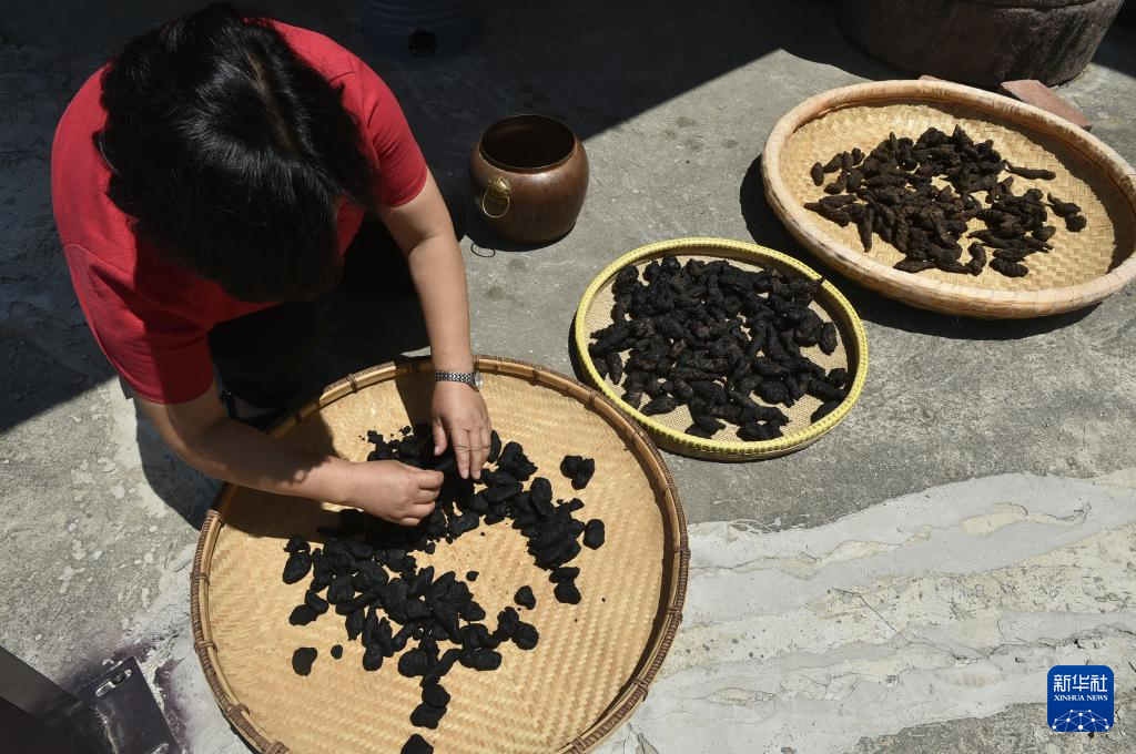 8月4日,在禹州中醫(yī)藥文化技藝傳習(xí)館,非遺項(xiàng)目“禹州中藥加工炮制技藝”代表性傳承人朱改蓮展示中藥材“九蒸九曬”加工技藝。