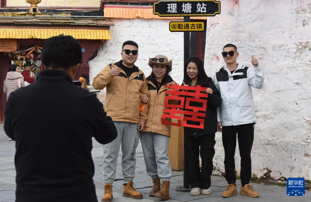 10月10日,游客在理塘縣勒通古鎮(zhèn)拍藏族風(fēng)情寫真。